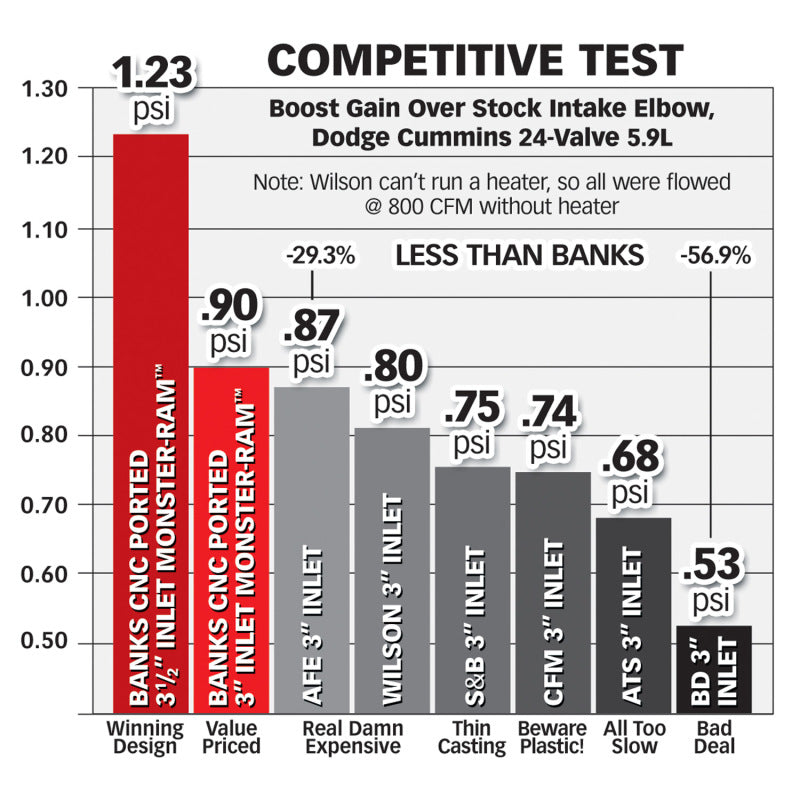 Monster-Ram raises boost without increasing backpressure at the turbine by Improving airflow from the intercooler. Result: a more responsive, fuel-efficient engine. Has six 1/8-inch NPT ports! The Banks Monster Ram is the highest performing Cummins Intake Elbow on the market, outflowing all competitors including our previous designs! Key Features: Delivers instant torque. Quicker throttle response. Improves airflow from the intercooler. Larger and less restrictive than stock intake. Raises boost without increasing turbine drive pressure. Uses OEM Boost Tube. Up to six 1/8-inch NPT ports. Out-boosts the competition by up to 56.9%. CNC port-matched for stock heater and Banks Billet Heater Delete. Optional 3.5-inch mandrel-bent boost tube