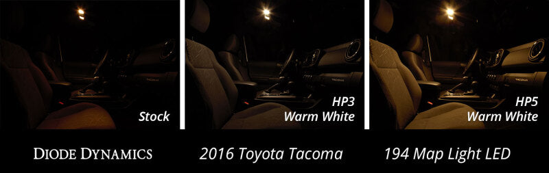 194 SMD2 LED Features Direct replacement for factory 194 incandescent bulb Adds more modern LED appearance Plug and play simple installation Overview Design. The 194 SMD2 LED bulb is a low-profile compact LED replacement for any 194-size bulb. The two 5050-size SMDs upgrade the factory yellowish incandescent bulb to a more modern LED appearance. The SMD2 was designed with an embedded load resistor and implanted diode for superior reliability. With its durable plastic connectors it will fit snugly in the socket and its light weight means it won't vibrate loose over time. Reliability. Unlike other bulbs on the market this bulb is built with constant-current circuitry along with transient suppression. That means this bulb will last for years not months with no flickering or failure. And like every Diode Dynamics product it's backed by an industry-leading three-year replacement warranty. Brightness. With 24 lumens of true measured output the SMD2 LED will provide similar light output to your original 5W 194 or 168 sized bulb. All Diode Dynamics LED lighting is rated with accurate measured lumen figures not calculations or guesses. We test the true output in-house and provide you the real numbers to compare. Colors. In addition to vibrant colors of blue red amber and green the 194 SMD2 is available in a cool white 6000K and warm white 3000K option as well. Whether you want a modern cool white appearance or a traditional warm white color we have the color to fit your need!