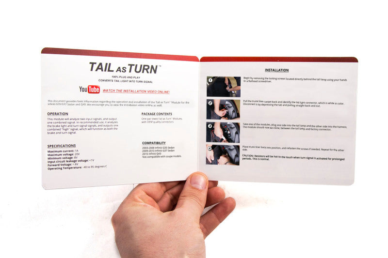 Features Converts your tail light to also function as the turn signal. OEM tail light connectors for simple plug-and-play installation. Assembled in USA. Overview Custom Appearance. This kit is compatible with Infiniti G37 Sedan 2009-2013 and will convert the LED tail light to also function as the turn signal. This kit will instantly customize your vehicle for a much more modern appearance on the road! This module does not include the option to convert your old turn signal location into additional backup lights. Easy Installation. Using OEM tail light connectors, the base kit is 100% plug-and-play and installs in minutes, with no wiring required. You don't even have to remove your tail lights! Experience. After over a decade in business, Diode Dynamics is the most trusted name in automotive LED lighting. Unlike every other LED distributor, we assemble and engineer products ourselves in the United States, for high quality and fast time-to-market of the newest and brightest LED technologies. We pride ourselves in offering only quality LED products that will exceed your expectations. Please contact us if you'd like to discuss your lighting project! What's Included Two (2) modules compatible with Infiniti G37 Sedan 2009-2013 One (1) Installation Guide