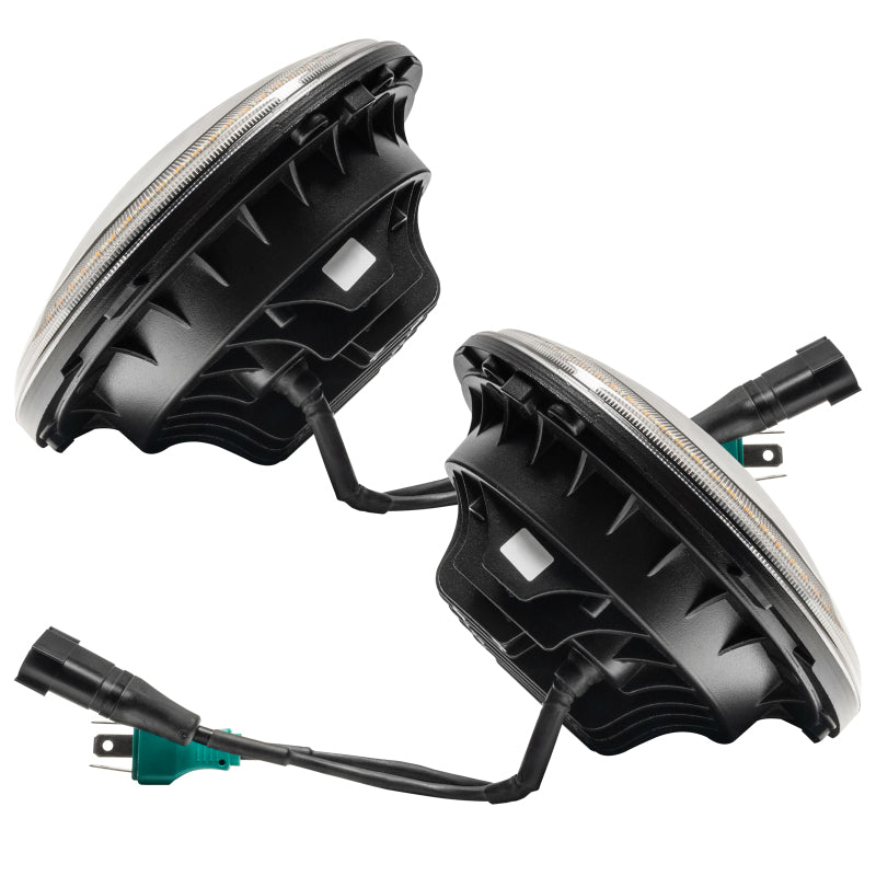 The Ultimate LED replacement Halo Headlight for the Jeep Wrangler JK NOW with an Integrated Amber Switchback Turn Signal! Increase night time visibility with high-quality LED illumination focused through advanced precision optics. Upgraded internal LED driver components allow the LED Low Beam to work with your JK Wrangler without the use of "flicker" adapters or other additional devices. Latest Improvements include: Improvements in brightness and reliability by adding a constant current LED driver to the main circuit board. Increased Reliability of the overall lifespan of the LEDS. Wider Input Voltage Range: The new SMD Halos can operate on a very wide voltage range from 12V-24V so that voltage spike can not damage the LEDs. Brighter/ More Even Light- by moving the heat load of the resistors off the PCB we are able to increase the number of LEDs on the circuit board without thermal issues. LED chips upgraded from a Cree LED to a Phillips Luxeon ZES chip.