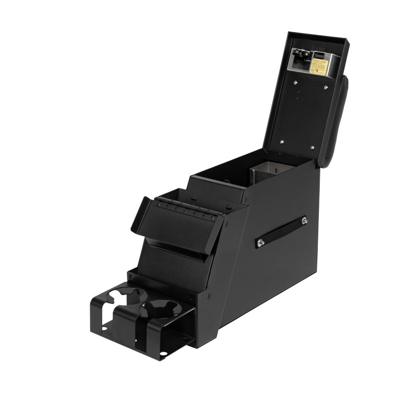 This convenient 6 1/2 inch wide, 16 gauge steel security console features Tuffy’s patented pushbutton latch system. For safety and convenience while operating the vehicle, the lid also latches closed without having to be locked. It has 2 compartments, a separate compartment for mounting a stereo, CB Radio, or other electronic equipment, and a lockable rear storage space lined with a rubber floor mat. The spacious rear compartment accommodates a CD changer, tools, and other valuables. Other accessories are also available.